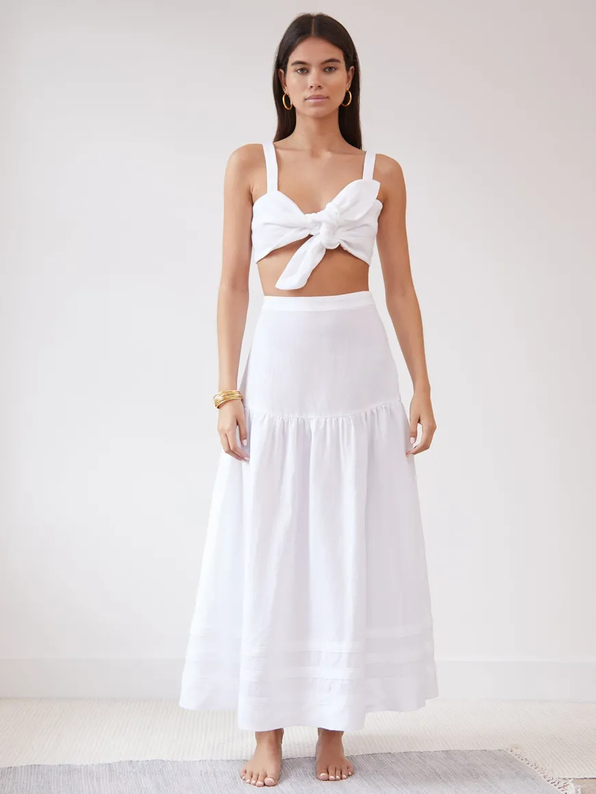 With a high-rise waist, followed by a maxi flared skirt that ends above the ankles, our Carmen skirt has a relaxed and romantic fit. Perfect for a walk around the city or to get lost in a tropical location.