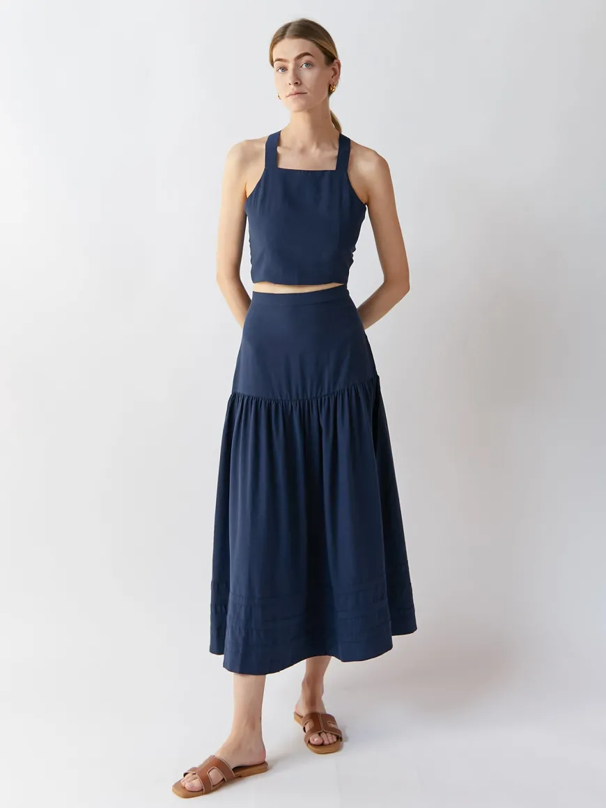 O has a relaxed and romantic fit with a high-rise waist followed by a maxi flared skirt that ends above the ankle. Perfect for a walk around the city or to get lost in a tropical location.