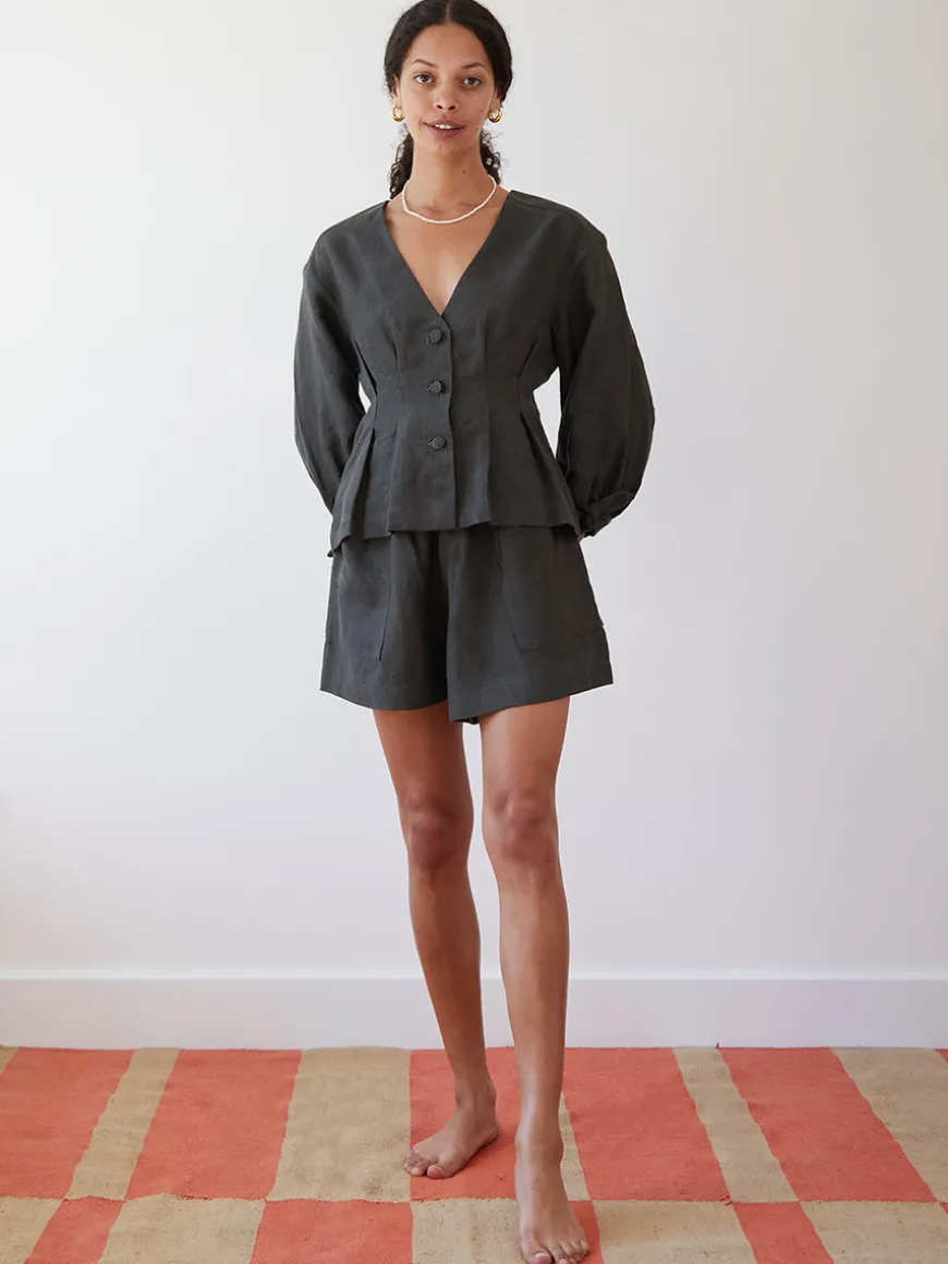 The Cayetana Blouse is crafted from breathable organic Belgium linen to a slightly structured silhouette buttoned up in the front and a V-shaped neckline which accentuates the silhouette. It has puffed sleeves and adjustable cuff ties.