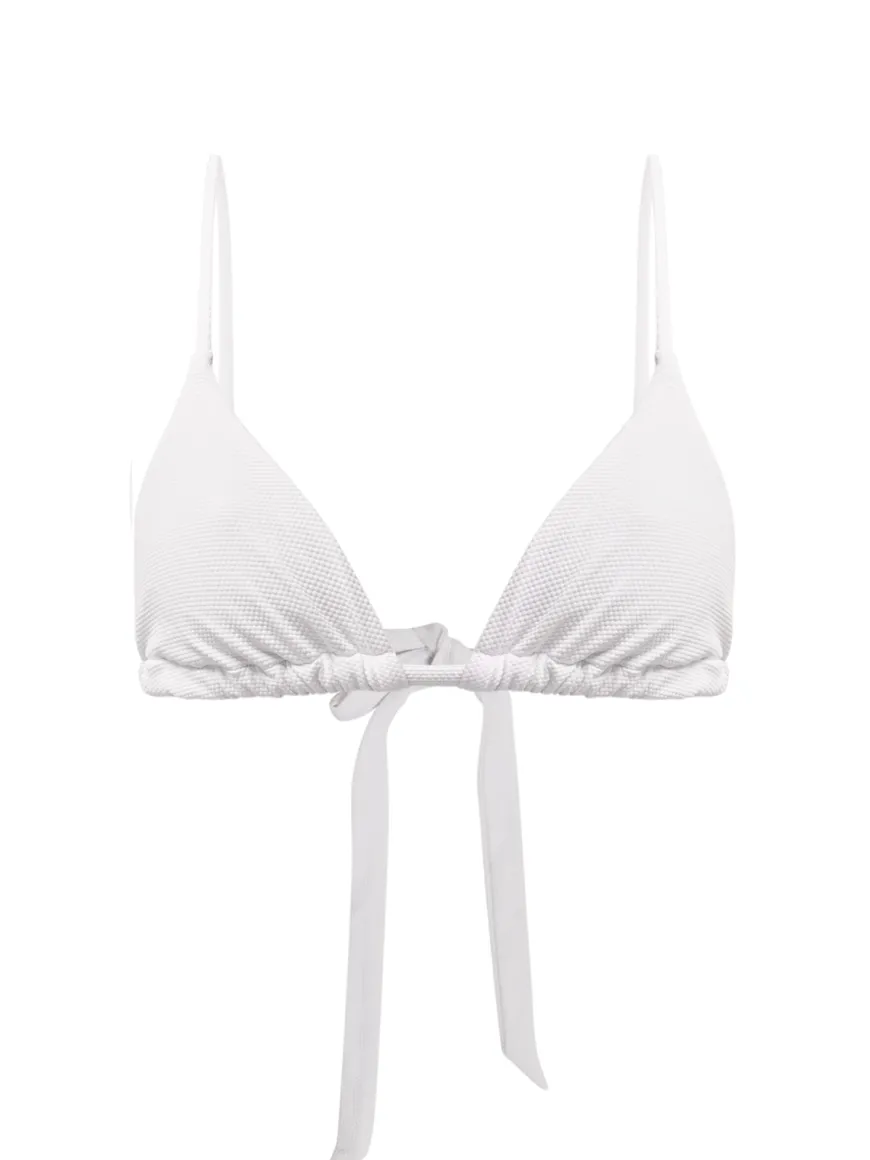 The Cindy top in optic white is made of our signature Italian textured fabric. We believe a simple white bikini is an essential to your swimwear collection. Giving the classic triangle a twist with a statement bow with long straps, this style suits all shapes and busts as it’s set on adjustable shoulder straps for extra support.