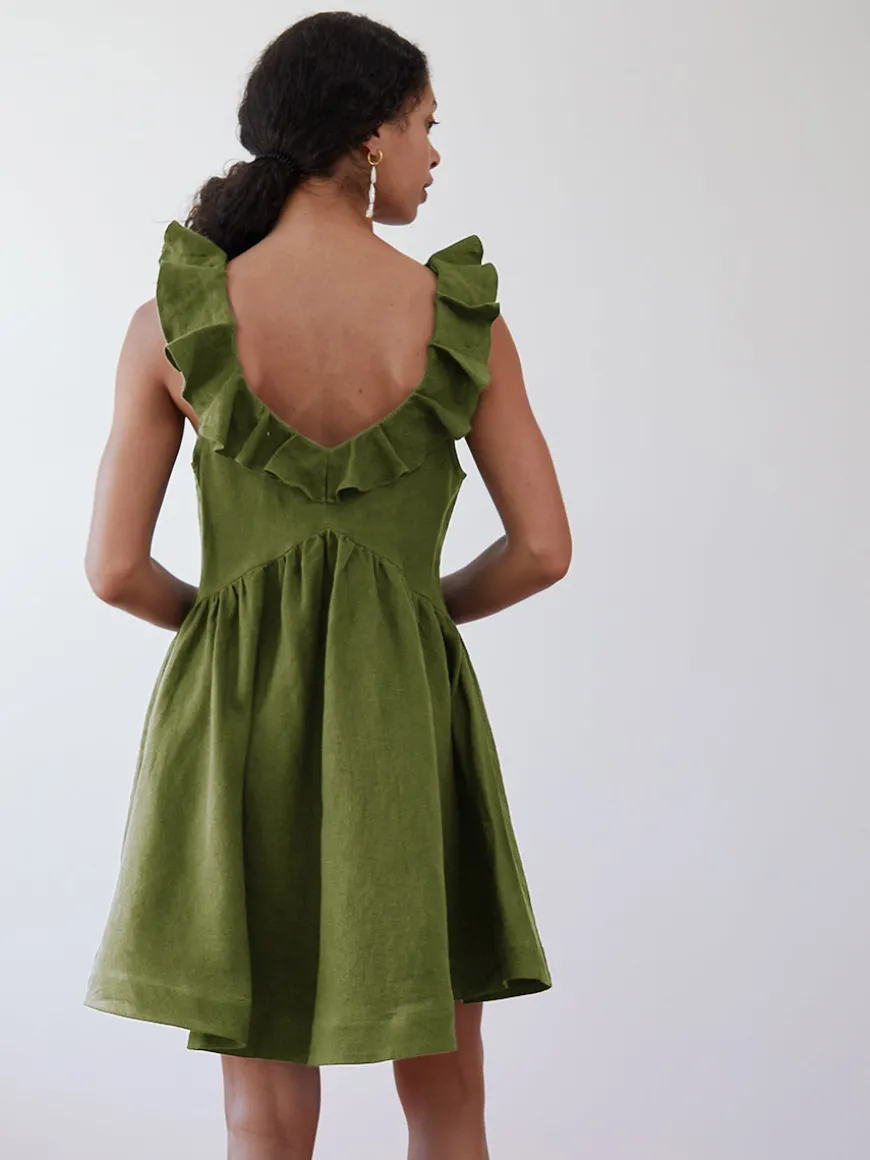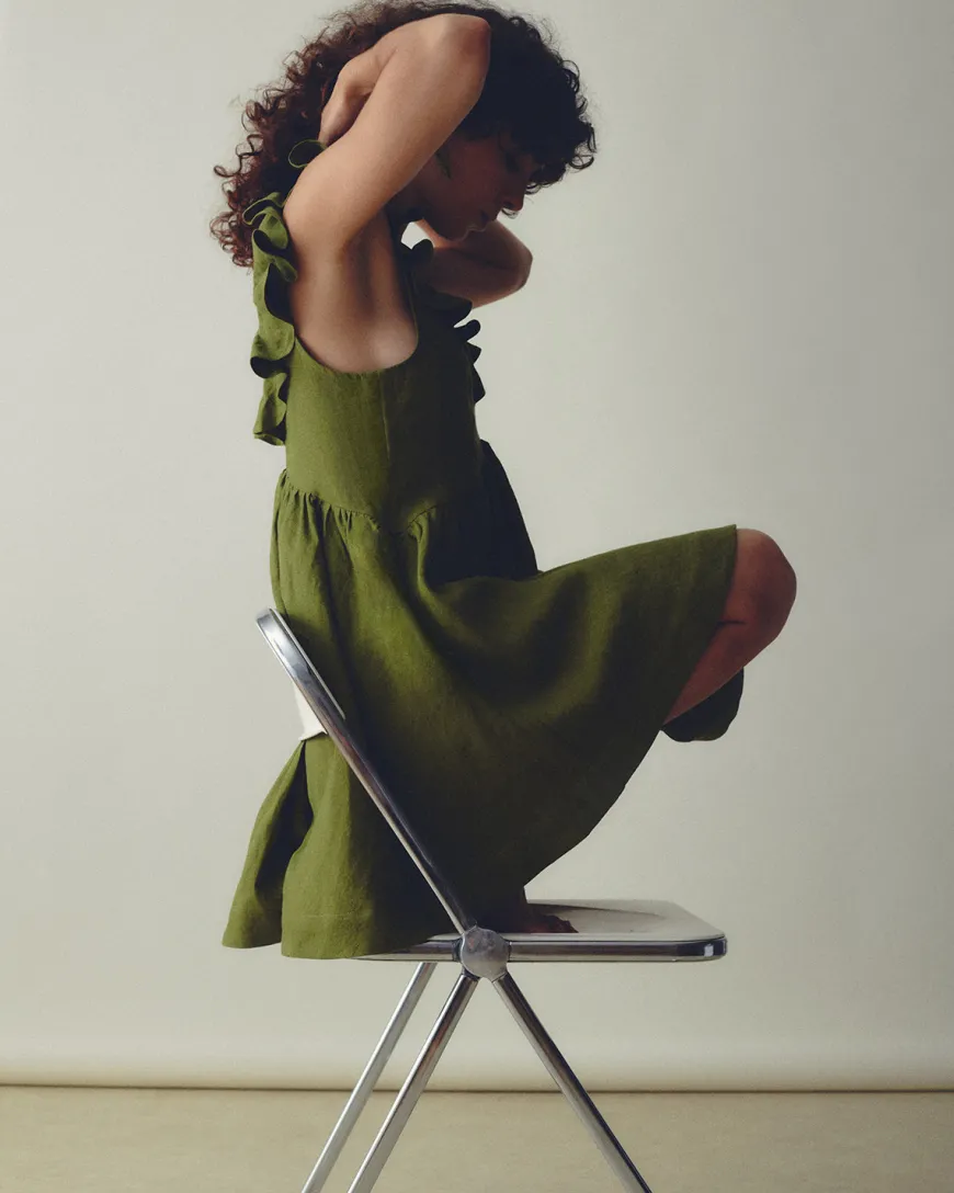 The Damasia mini dress is crafted from breathable organic Belgium linen to a fun and feminine silhouette, featuring a V-shaped neckline enhanced by ruffles all around. Ground the playful spirit with strappy leather sandals and you will be ready for a lovely summer day.