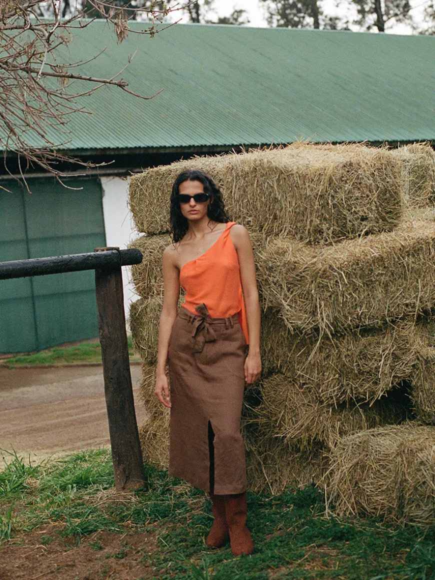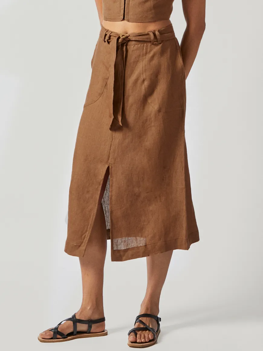The Dana skirt is a versatile mid-length piece that offers both style and functionality. With its comfortable packet pockets and front and back slit design, this skirt is perfect for any occasion.