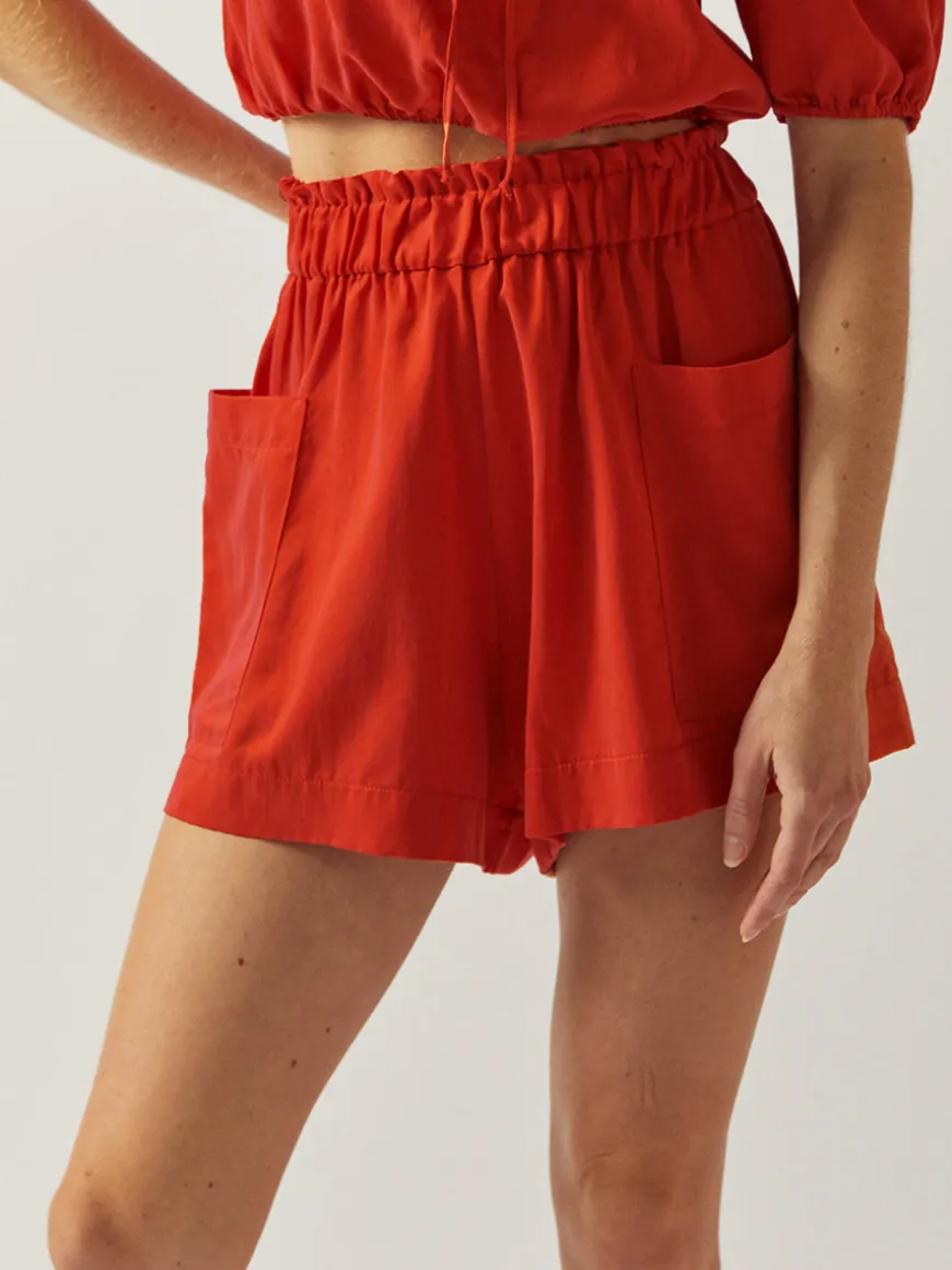 The Emilia Shorts are made from lightweight cupro, this comfortable pair has a relaxed silhouette with a high-rise elasticated waistband and convenient maxi side pockets.