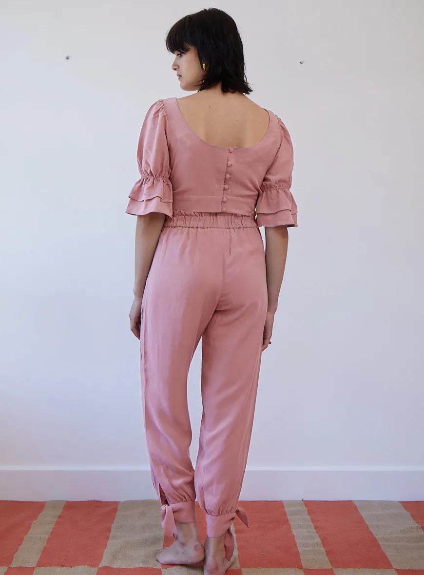 The Eugenia Top is crafted from super soft cupro to a fitted and cropped silhouette. The scooped neckline and puffy mid length sleeves add to a feminine look that can be worn with high-rise jeans or color coordinated with our new Pamela trousers.