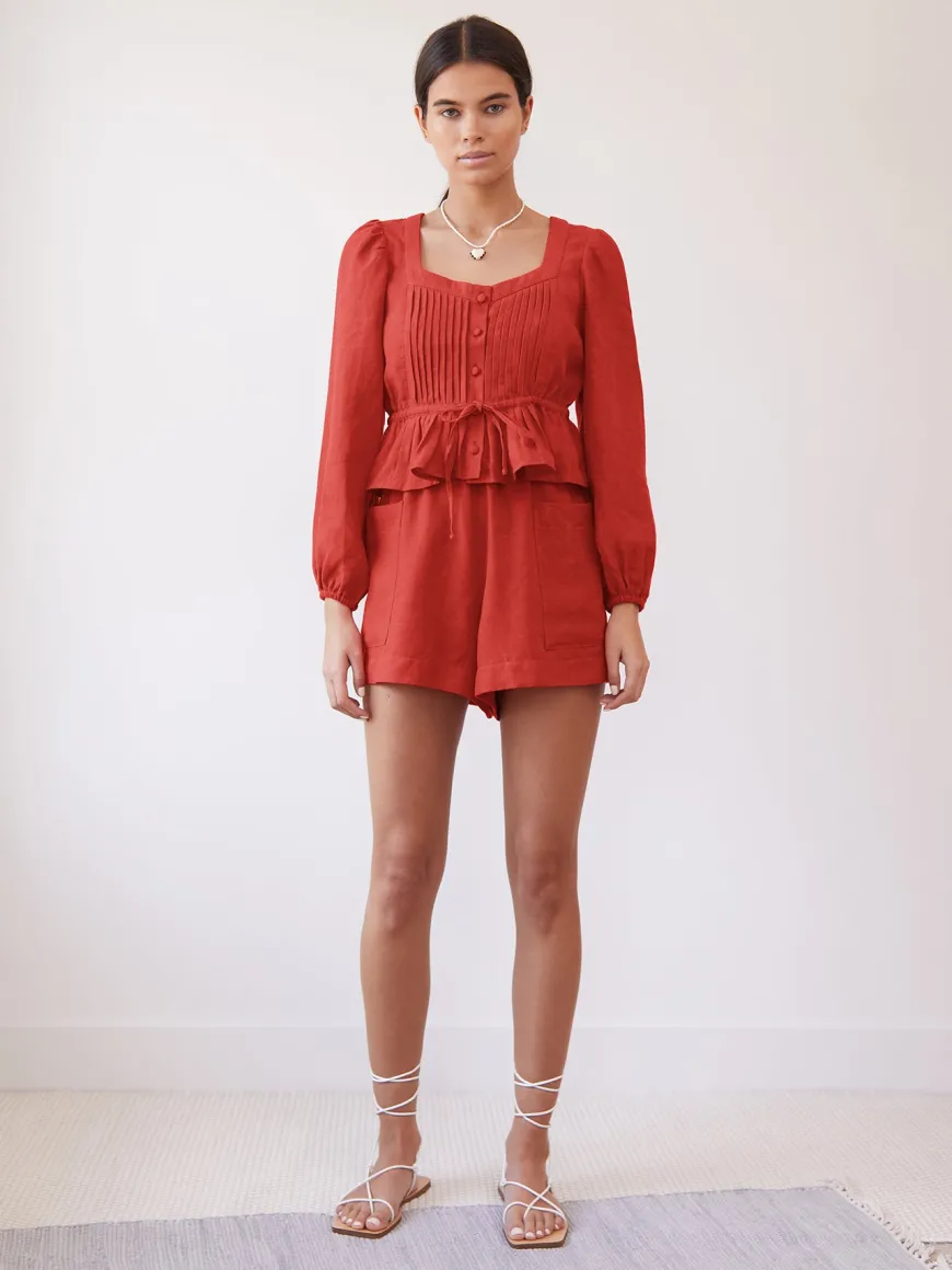 The Fini top features a heart neckline and a slightly structured silhouette pintucked and buttoned up in the front, followed by long puffed sleeves. Perfect for a day out or to be paired with our bestselling Natalia trousers and Emilia Shorts and it’s crafted from breathable organic Belgium linen to a loose silhouette.