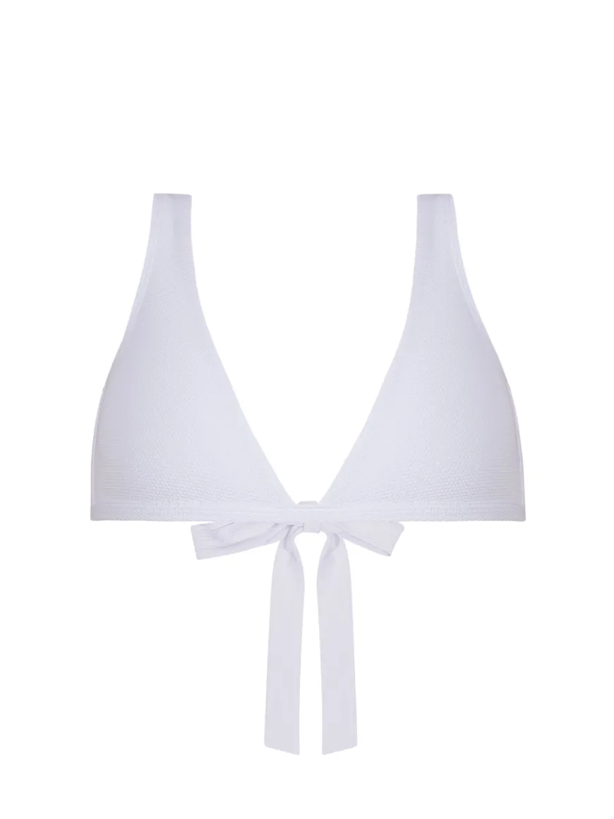 The Flo top in optic white is made of our signature Italian textured fabric. We believe a simple white bikini is essential to your swimwear wardrobe. Featuring a plunge neckline with a statement bow at the back, this style suits all shapes and busts but it is specially designed for extra support and bigger cup sizes.