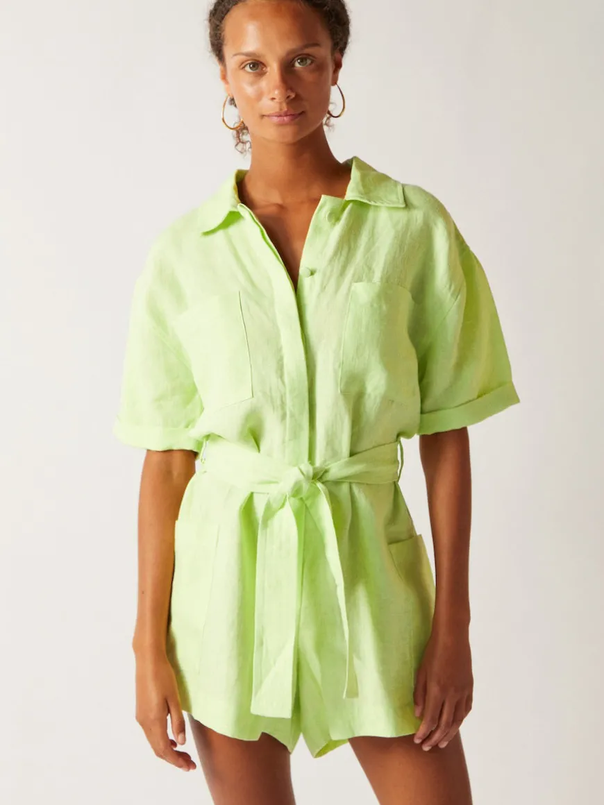 A lightweight jumpsuit made from breathable linen, ideal for cooling off on the deck, wandering to new destinations or having lunch by the pool. Comfortable silhouette with a belt on the waist for a personalized fit.