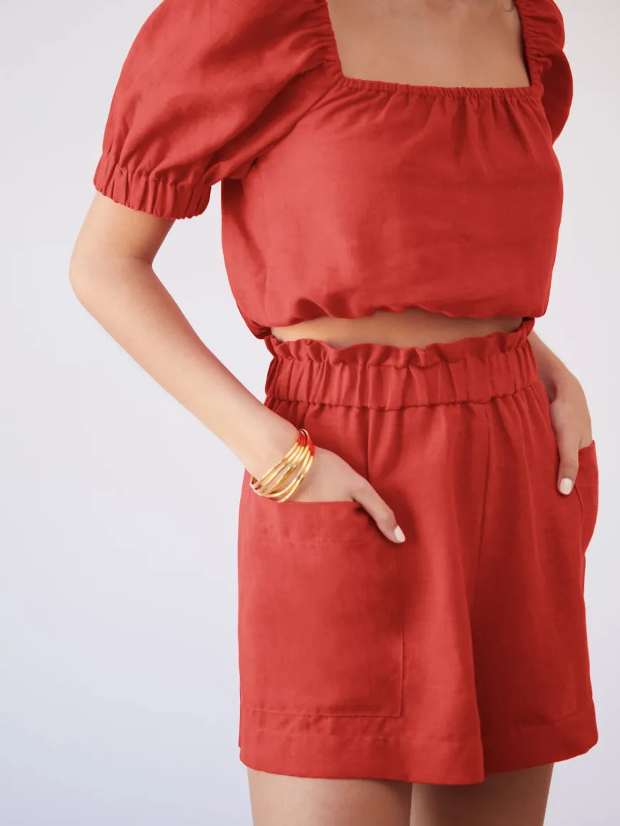The Siena top is the perfect top to go with any of our bottoms. It’s crafted from a soft and breathable organic linen. This top has short puffed sleeves, squared neckline and a cropped elasticated hem.