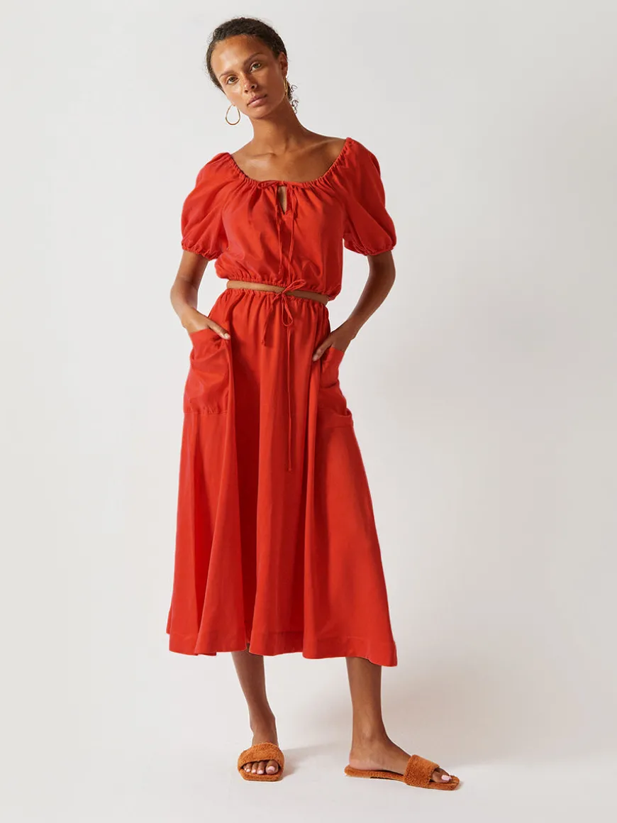 The Sol midi skirt is a fresh mid-length skirt with side pockets. It’s made from lightweight, breathable fabric for a comfortable and stylish fit. Ideal for everyday wear or special occasions.