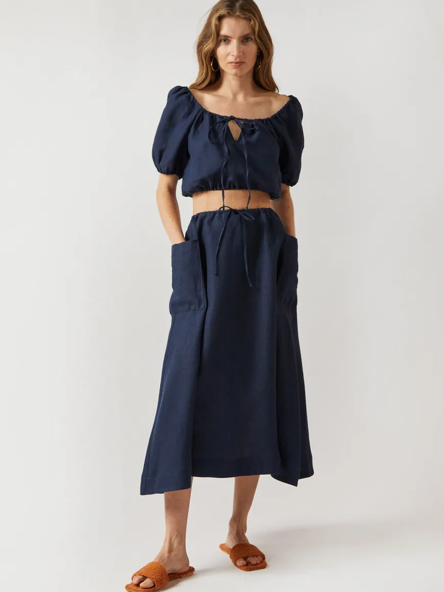 The Sol midi skirt is a fresh mid-length skirt with side pockets. It’s made from lightweight, breathable fabric for a comfortable and stylish fit. Ideal for everyday wear or special occasions.