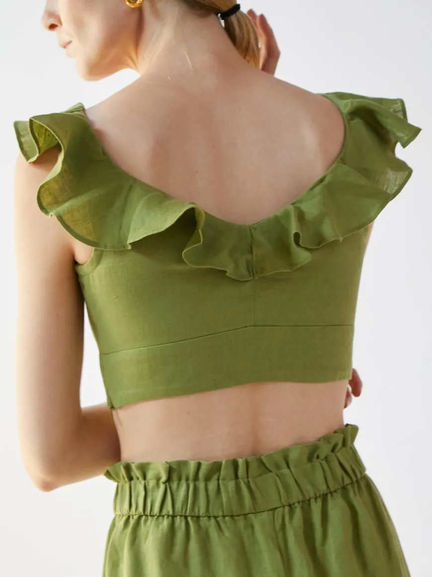 The Valeria Top is crafted from breathable organic Belgium linen to a fitted and cropped silhouette. The V-shaped neckline trimmed with ruffles add to a feminine look that can be worn with high-rise jeans or with our bestselling Natalia trousers and Emilia Shorts.