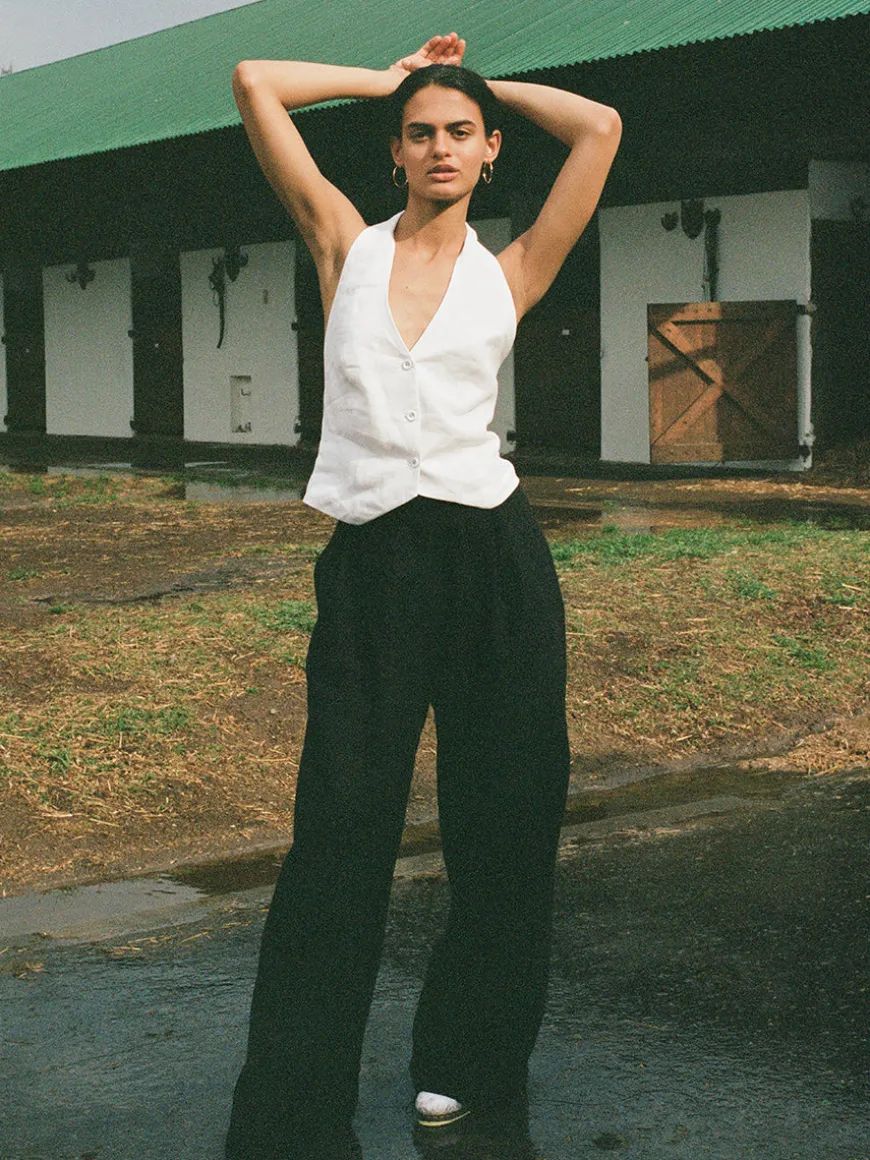 The Abi waistcoat is a tailored and stylish piece with a halter neck design and a free back. It offers a flattering and comfortable fit that will elevate any outfit.