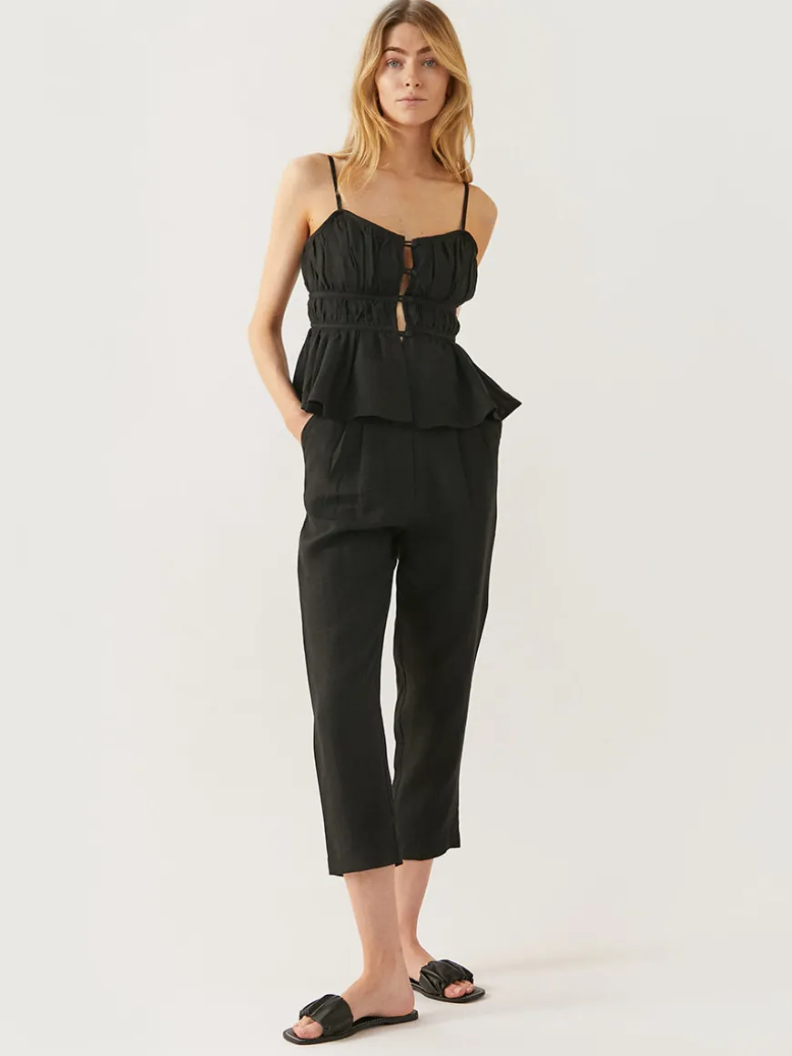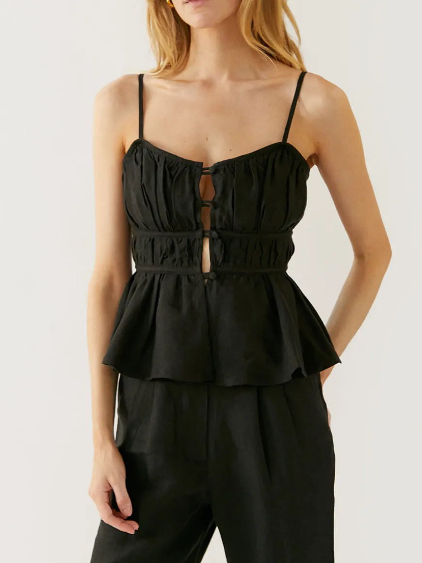 This full-gathered top is crafted from breathable organic linen with spaghetti straps and self-fabric covered buttons on the front.