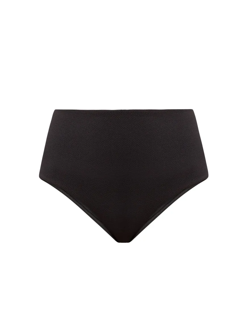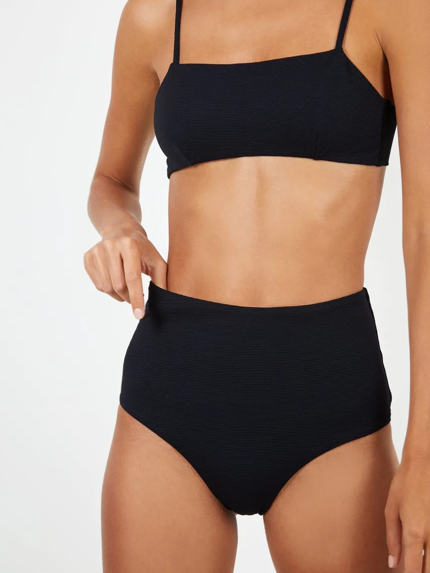 The Ana Bottom in black is a sculpting high-rise brief that echoes 50’s styles. The smoothing italian pebbled material molds to your figure, while the top has side boning for extra support and to make the fit even more complimentary.