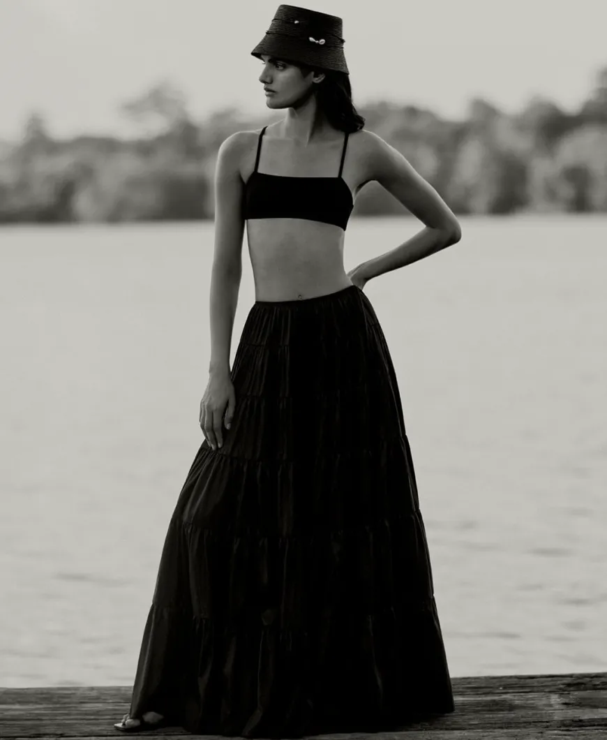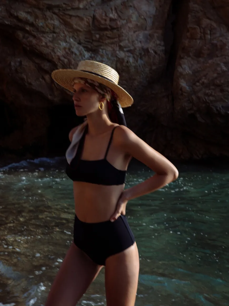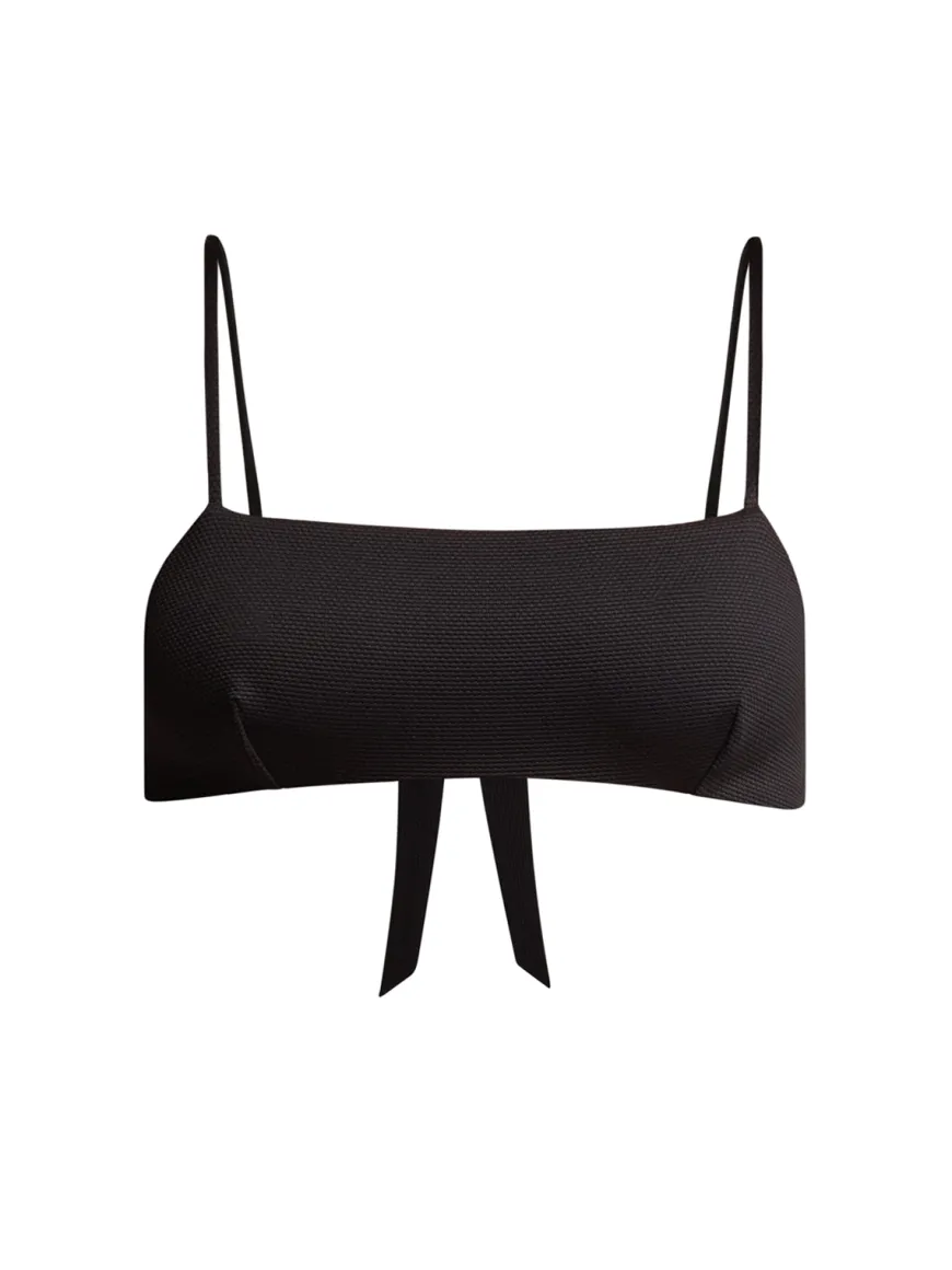 The Ana Top in black is a sculpting top that echoes 50’s styles, it has a square neckline, thin straps and a statement bow at the back. Wear it in the signature pebbled stretch fabric or reverse it into the smooth savanna green for a change.