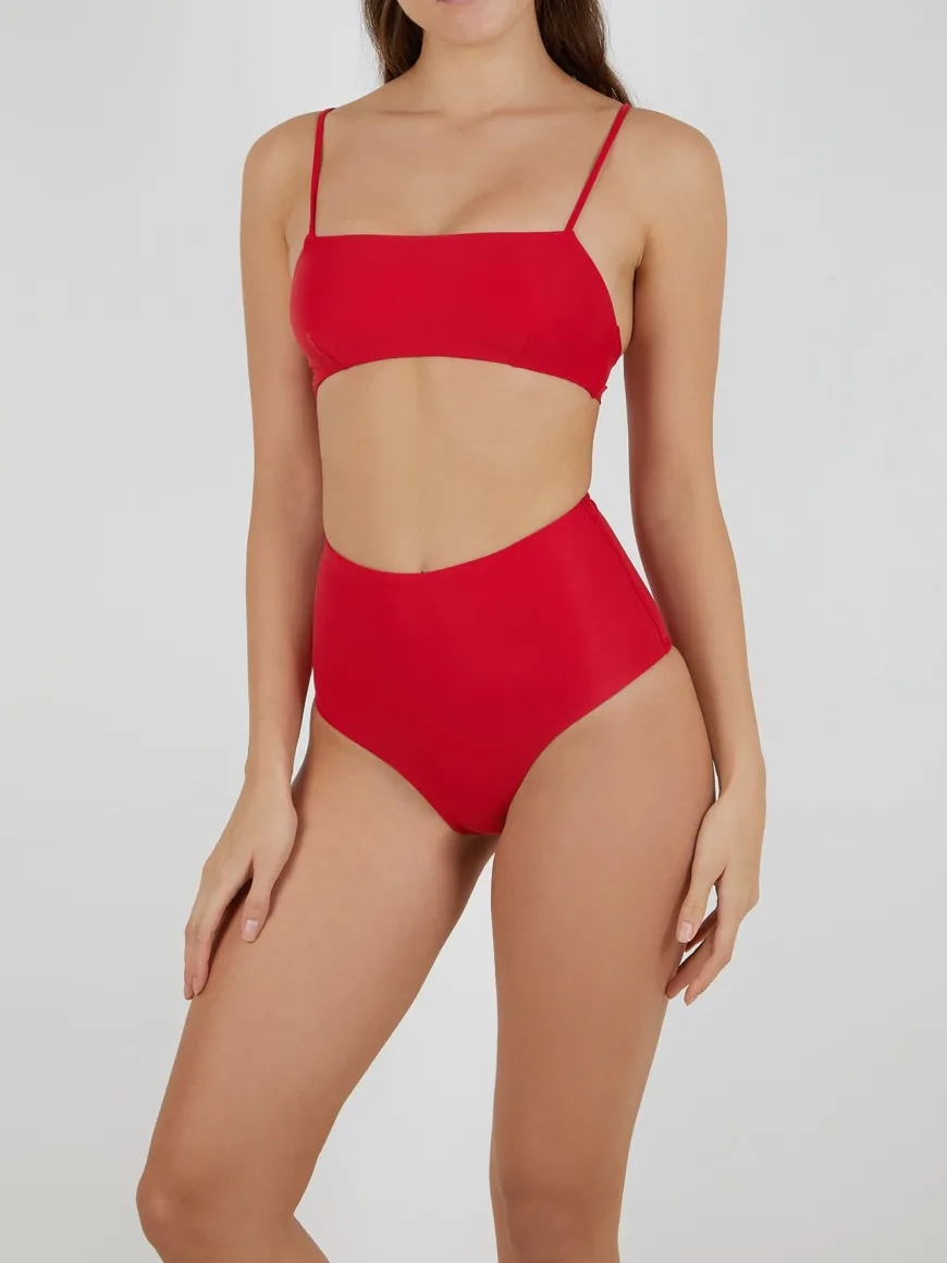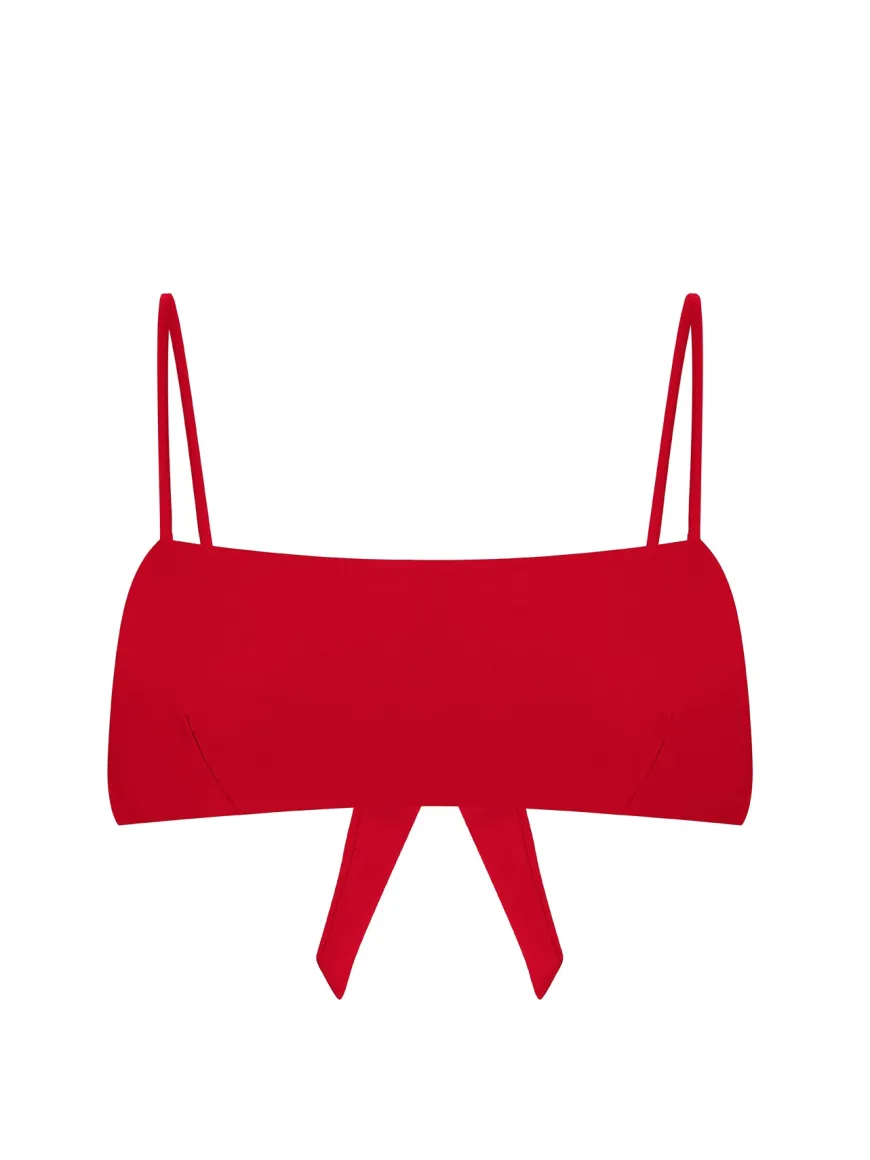 The Ana Top in red is a sculpting top that echoes 50’s styles, it has a square neckline, thin straps and a statement bow at the back. The super soft italian Econyl lycra molds to your figure.