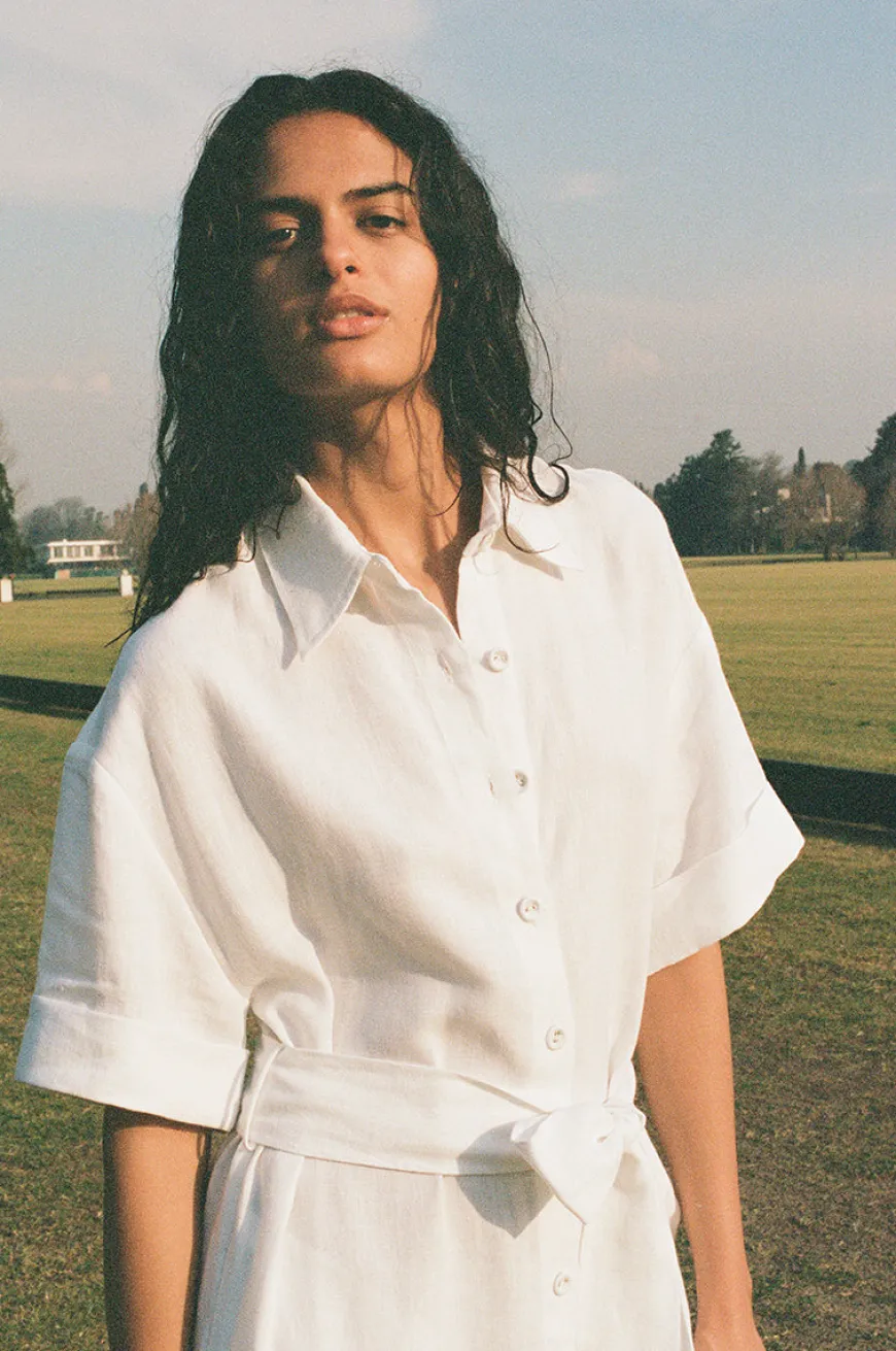 This timeless design is the perfect piece for effortless elegance. Featuring a classic shirt dress silhouette, this midi-length design is tailored to flatter, crafted in our breathable, organic linen.