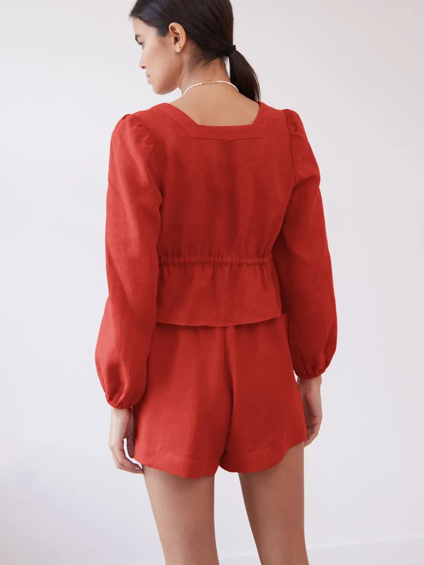 The Fini top features a heart neckline and a slightly structured silhouette pintucked and buttoned up in the front, followed by long puffed sleeves. Perfect for a day out or to be paired with our bestselling Natalia trousers and Emilia Shorts and it’s crafted from breathable organic Belgium linen to a loose silhouette.