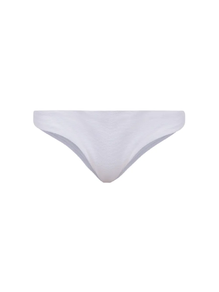 The Flo bottoms in white are made of our signature jet optic white Italian textured fabric. Inspired in a flattering Brazilian-cut silhouette that sits low on the hips to visually elongate your torso. Free from hardware, this style is the perfect basic combination with any top of your choice.