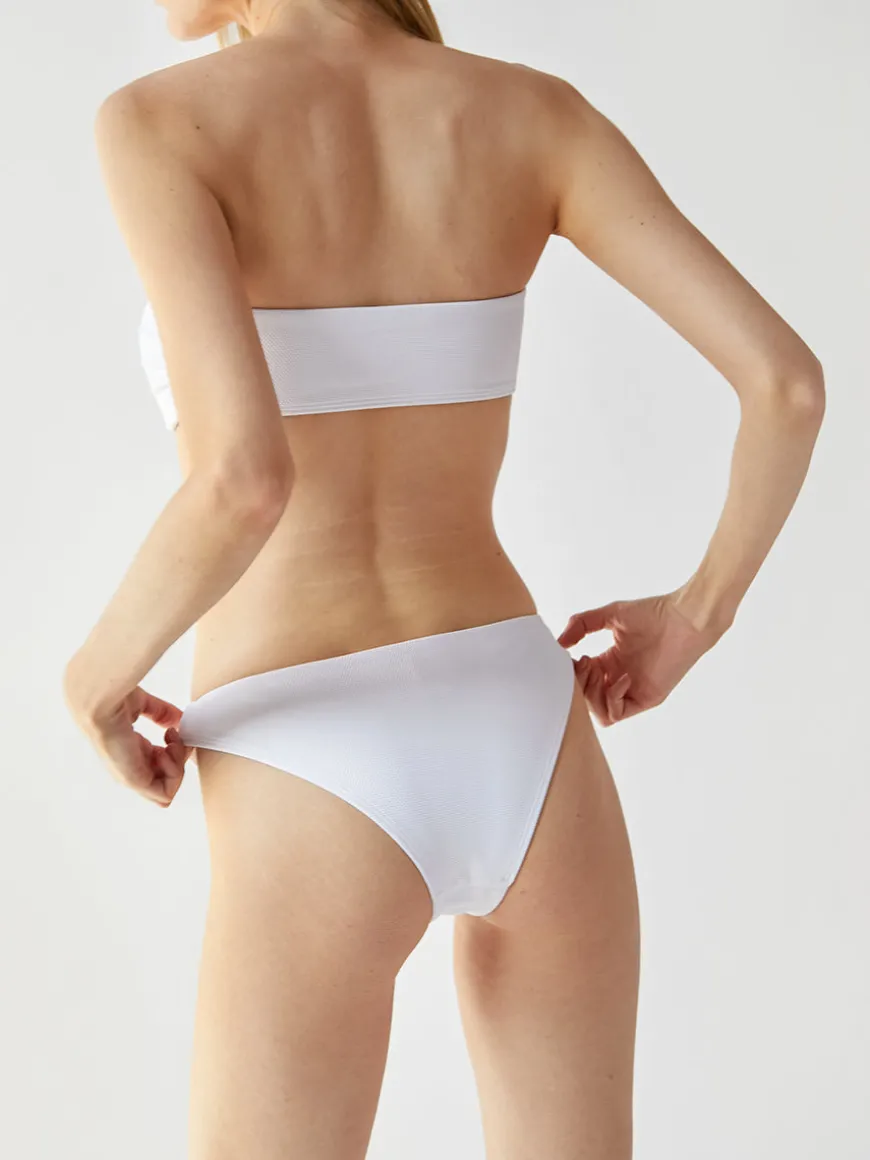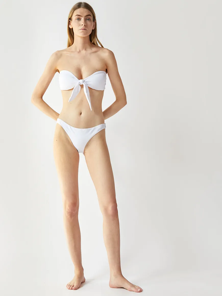 The Flor bottoms in white are made of our signature jet optic white Italian textured fabric. Inspired in a flattering Brazilian-cut silhouette that sits low on the hips to visually elongate your torso. Free from hardware, this style is the perfect basic combination with any top of your choice.