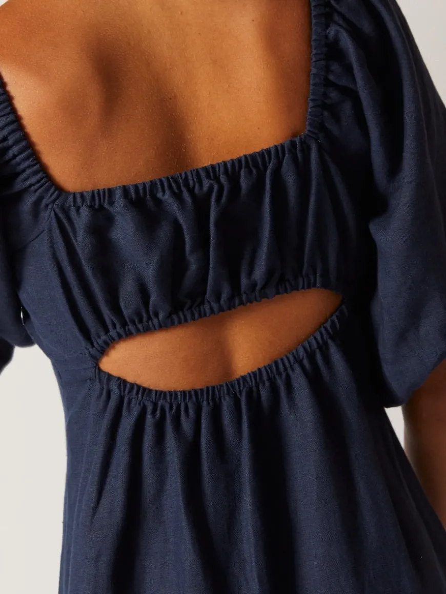 The Frida dress is crafted from breathable organic Linen. This elegant dress with wide puffed sleeves features an elastic-fitted neck that molds to your figure and a chic back keyhole.