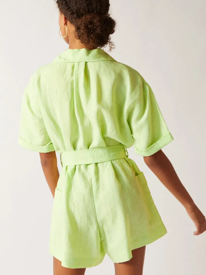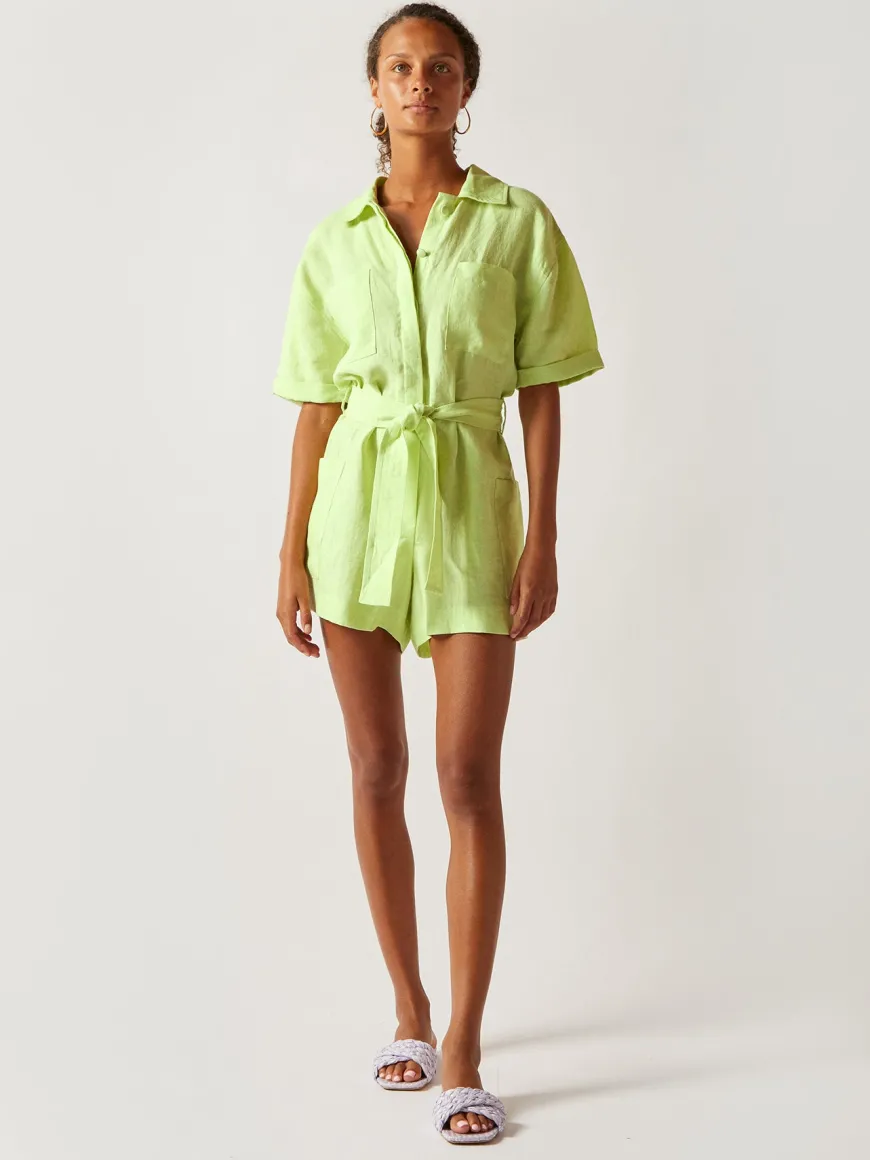 A lightweight jumpsuit made from breathable linen, ideal for cooling off on the deck, wandering to new destinations or having lunch by the pool. Comfortable silhouette with a belt on the waist for a personalized fit.