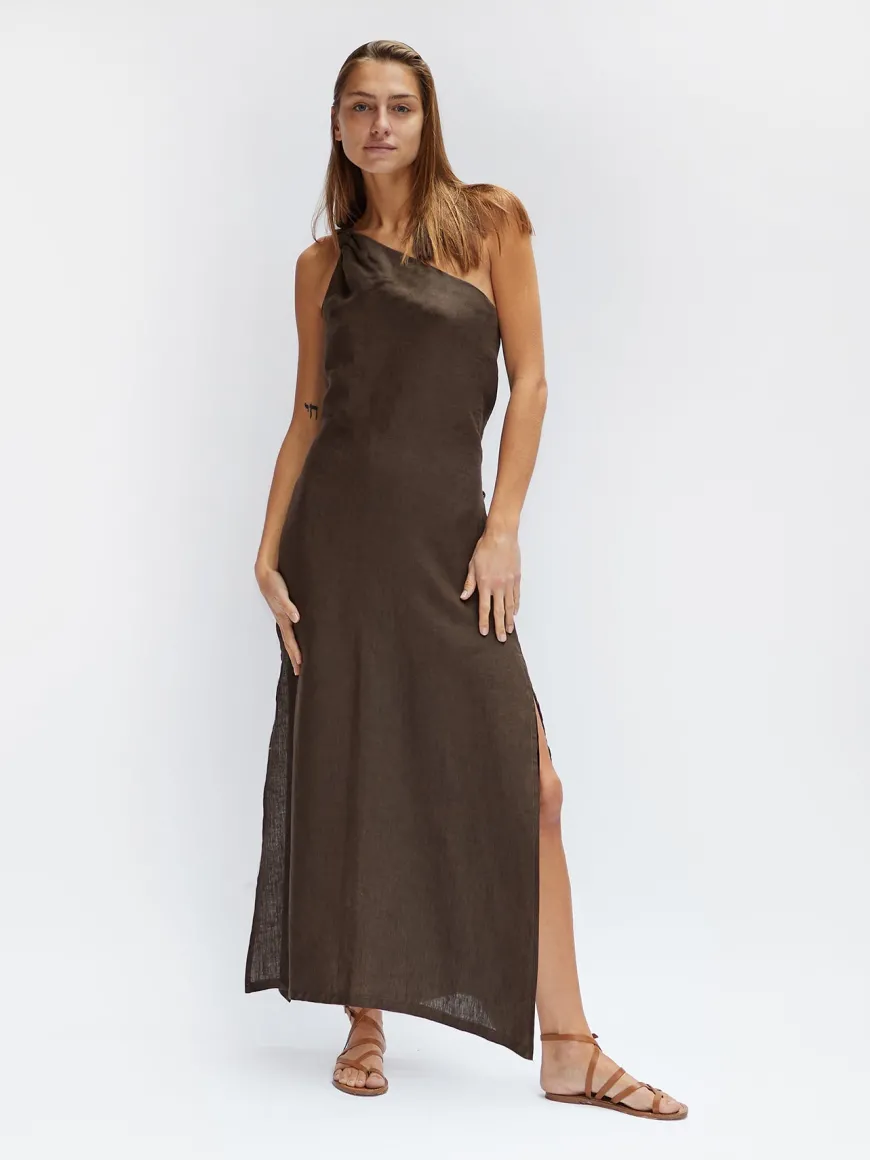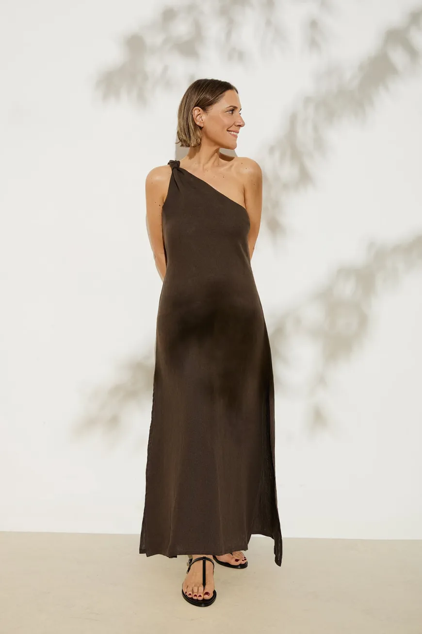 The Laura dress is crafted in our breathable organic linen, this one shoulder dress features a knot on the shoulder as a simple detail adding a chic touch.
