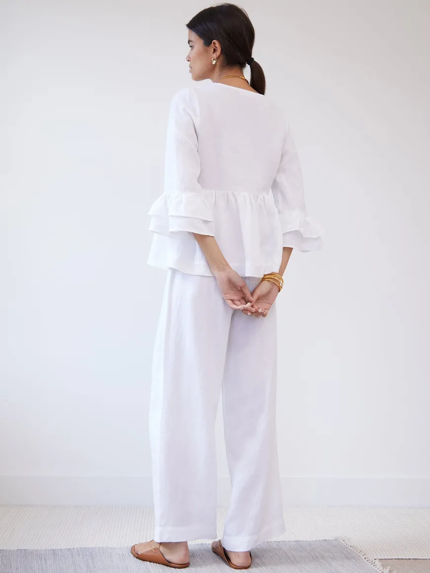The Natalia trousers are crafted from breathable organic Belgium linen to a loose silhouette with a comfortable elasticated waistband. they are thought for a relaxed fit with a high-rise, paperbag waist then falls into long wide legs.