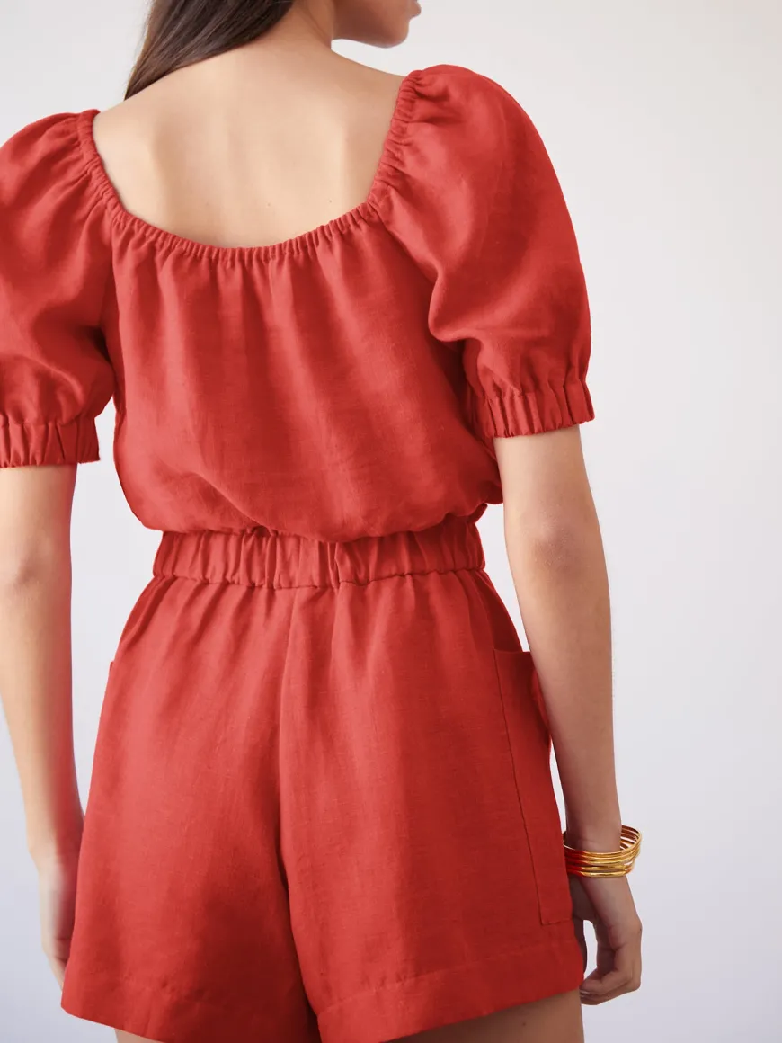 The Siena top is the perfect top to go with any of our bottoms. It’s crafted from a soft and breathable organic linen. This top has short puffed sleeves, squared neckline and a cropped elasticated hem.
