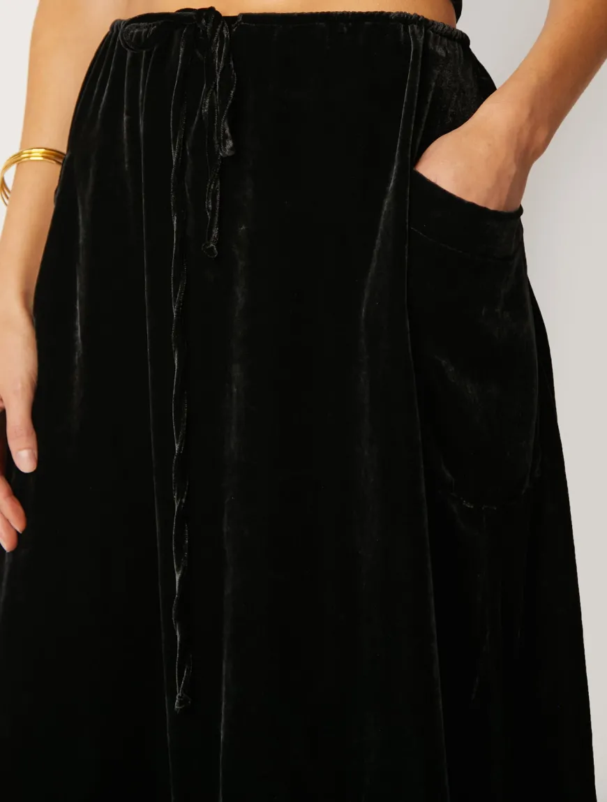 The Sol midi skirt offers a relaxed mid-rise fit, side pockets, and a mid-length design. Our new velvet material offers a luxurious look and feel and provides a timeless elegance suitable for any occasion.