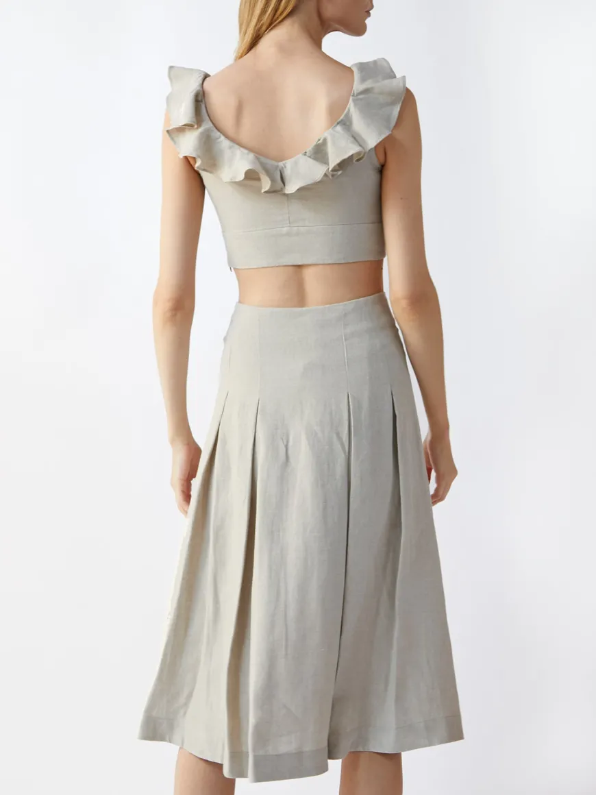 The Valeria Top is crafted from breathable organic Belgium linen to a fitted and cropped silhouette. The V-shaped neckline trimmed with ruffles add to a feminine look that can be worn with high-rise jeans or with our bestselling Emilia Shorts and our new Margarita Skirt.