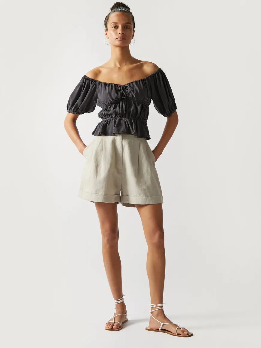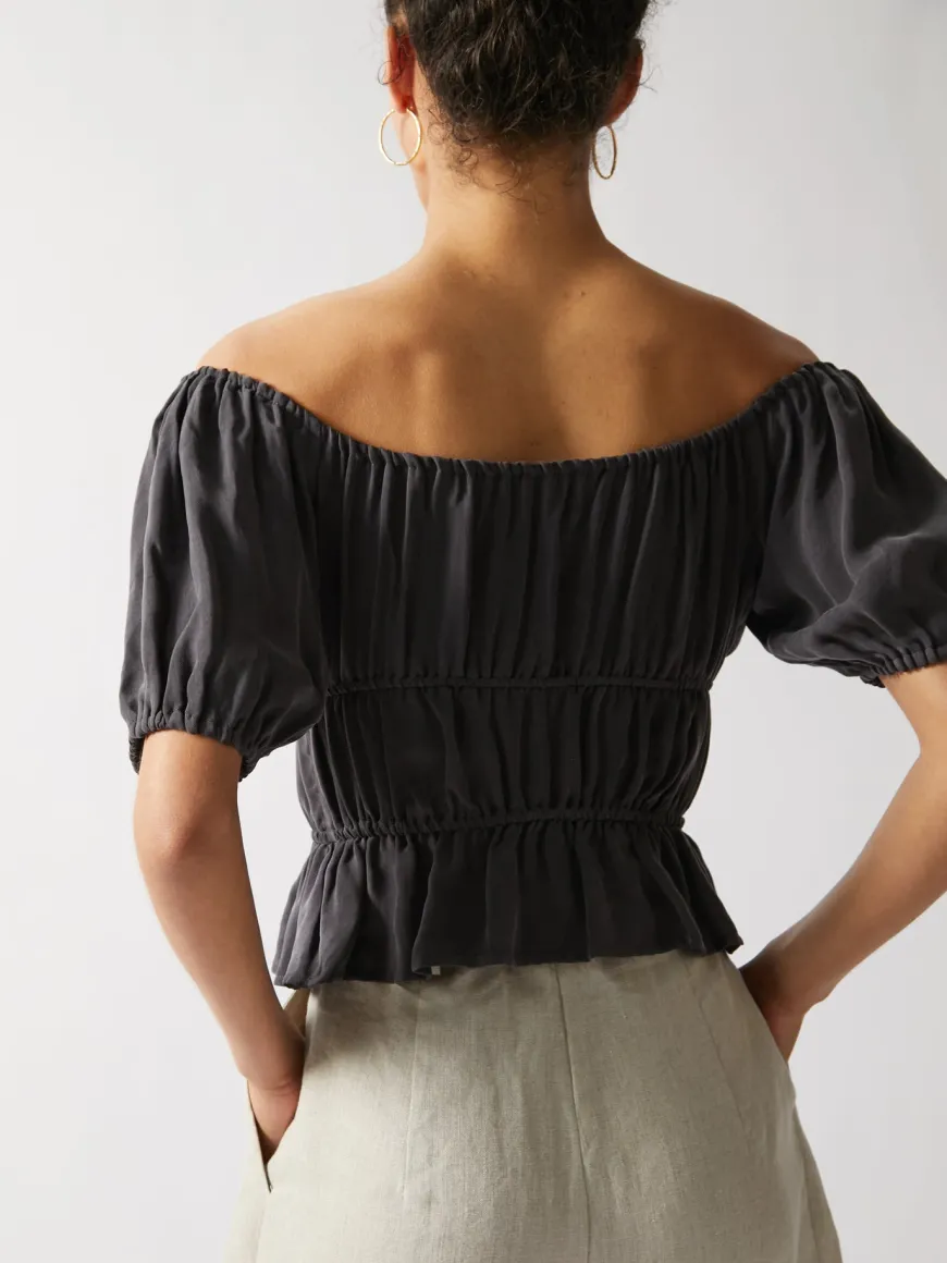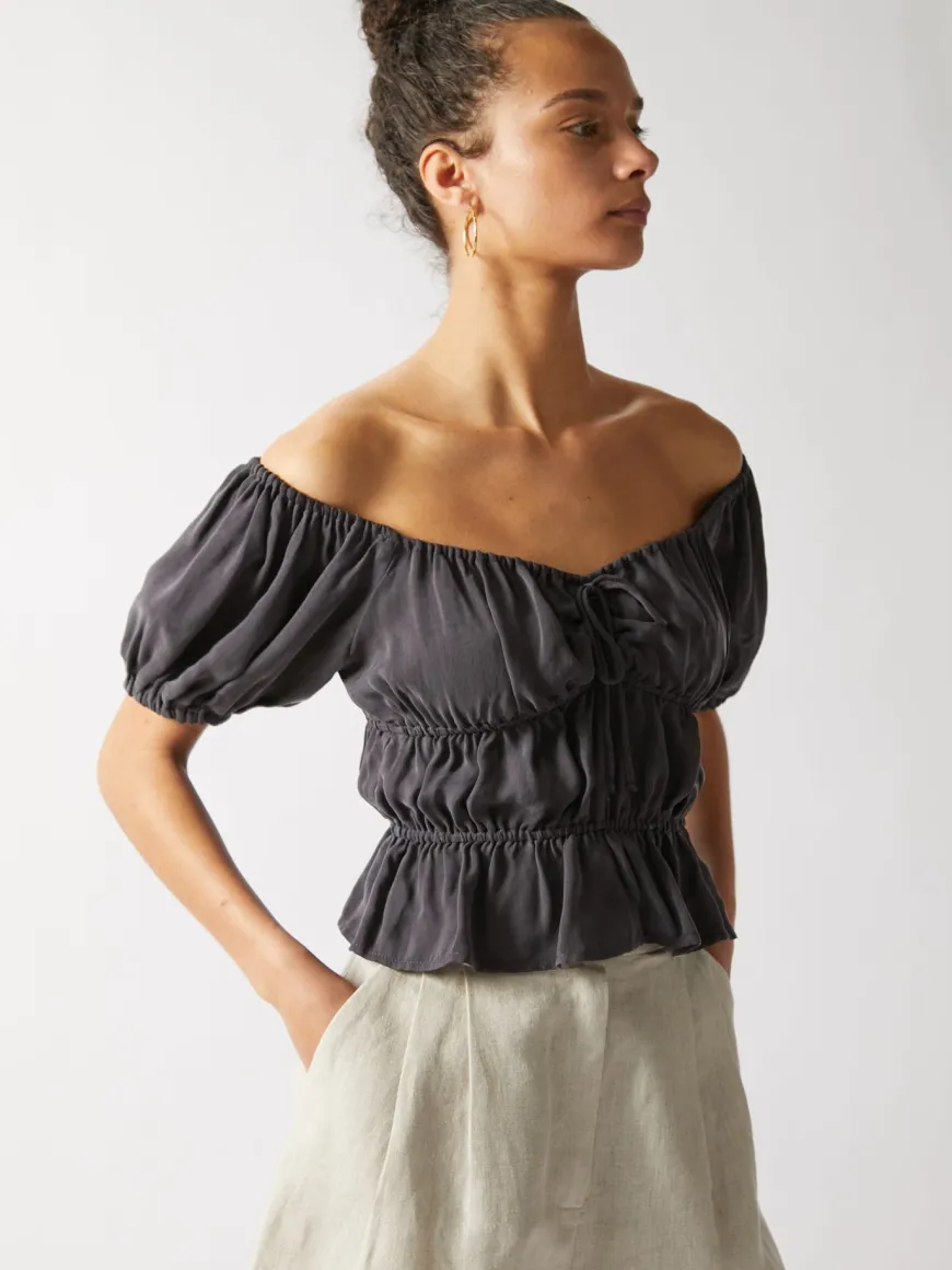 This off-shoulder top is crafted from our lightweight, breathable cupro. Featuring a gathered top with a peplum bottom is perfect for any look.